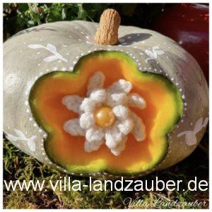 Herbstzeit ist KÜRBISZEIT! Und auch in diesem Jahr habe ich es mir nicht nehmen lassen zum Herbstfinale extra einen Kürbis zu schnitzen. Euch hat ja mein gehäkelter Blumenkürbis soooo gut gefallen und Ihr habt mir bereits so unendlich viele Fotos geschickt und Nachrichten geschrieben. Deshalb habe ich in diesem Jahr einfach mal einen BLUMENKÜRBIS geschnitzt. Und ich wäre ja nicht Frau Landzauber, wenn der Kürbis nicht noch ganz BESONDERES gestaltet