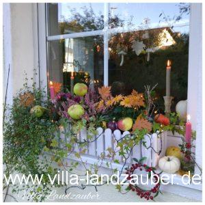 Wie versprochen nehme ich Euch heute mit in unsere Küche. Aber bevor es los geht, zeige ich Euch noch unser dekoriertes Küchenfenster von draußen. Ich habe Euch ja auch noch einen kleinen Lichterzauber angekündigt 🙂 Nun ist es ja draußen schon sehr früh dunkel. Deshalb habe ich unseren Landhauskasten herbstlich dekoriert und auch schon mit einer Lichter- kette beleuchtet. Gerade wenn ich mit Merlin morgens ganz früh in den Garten