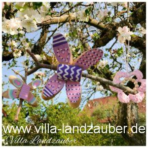 Herzlich Willkommen bei den Flatterinos! Die Flatterinos sind eine lustige Schar von Flattermännern. Sie sind komplett aus Naturmaterialien gemacht und mit Acrylstiften bemalt. Sie flattern nun in luftiger Höhe bei uns im Garten. Hast Du Lust die ganze Bande kennenzulernen? Dann komm doch einfach mit! Dann zeige ich sie Dir…. Sie sind alle aus kleinen Astgabeln und Holzscheiben gefertigt und in Pastellfarben bemalt. Zum Teil habe ich auch noch Muster
